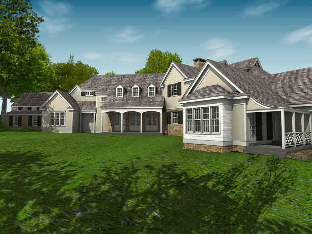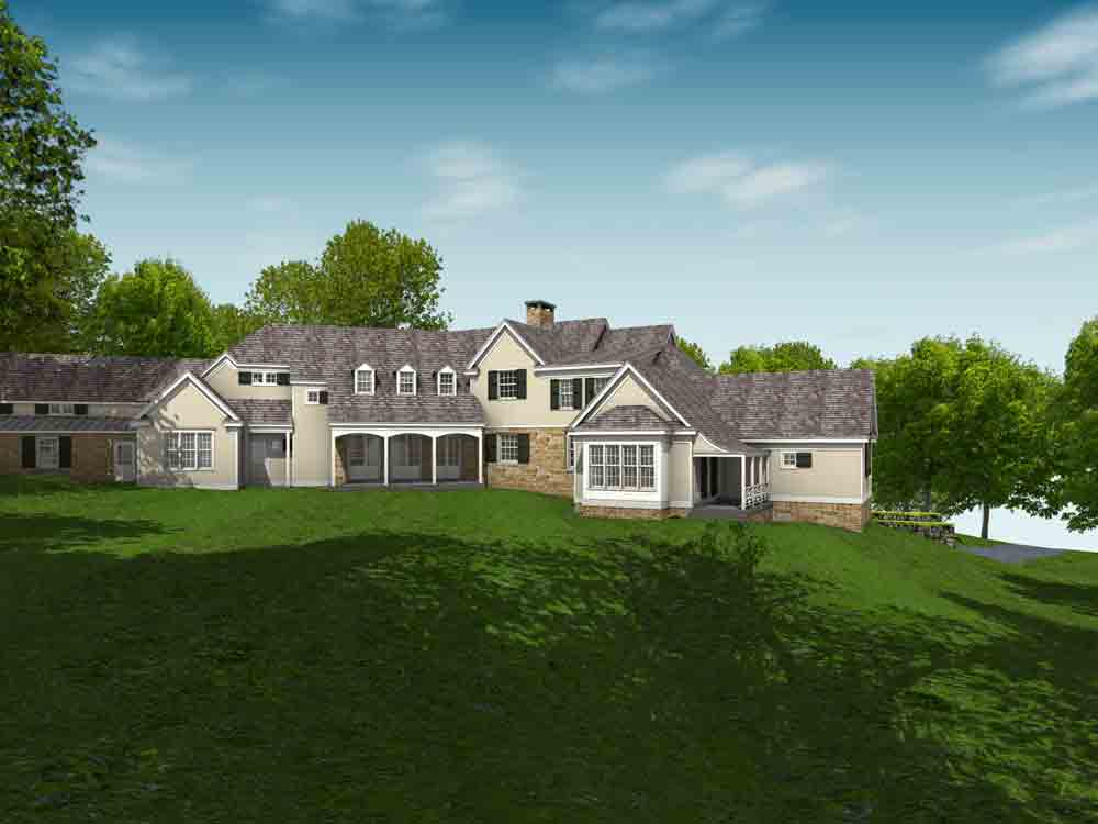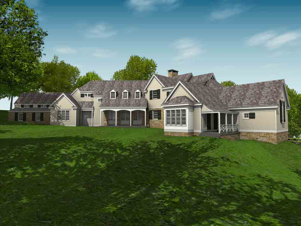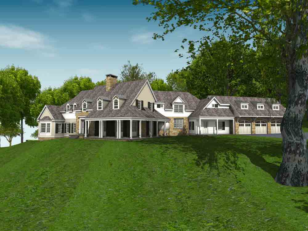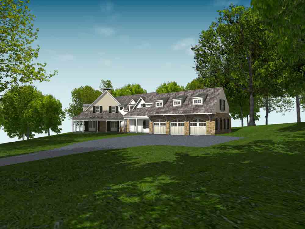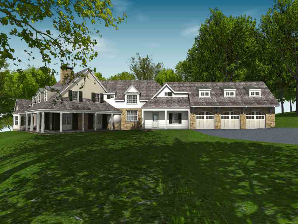 This design for a farmhouse has 5 bedrooms, 5 full baths, 3 half baths, office, sitting room, homework/playroom, family room, three covered porches, 3 car garage, lower level min-garage for sports vehicles, two fireplaces, and room to expand for guest suite above garage.