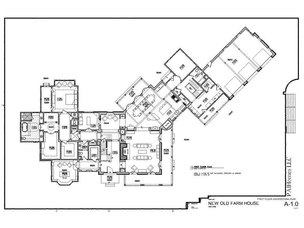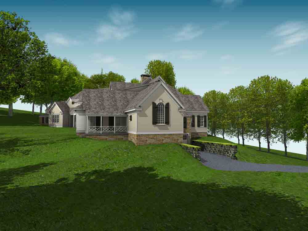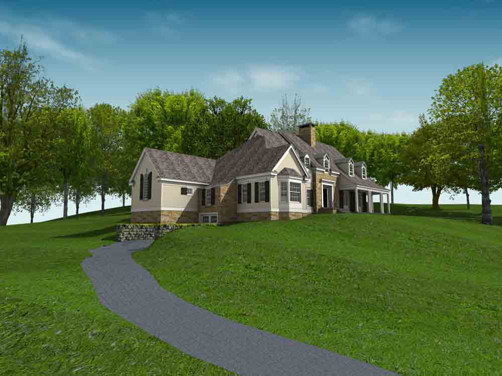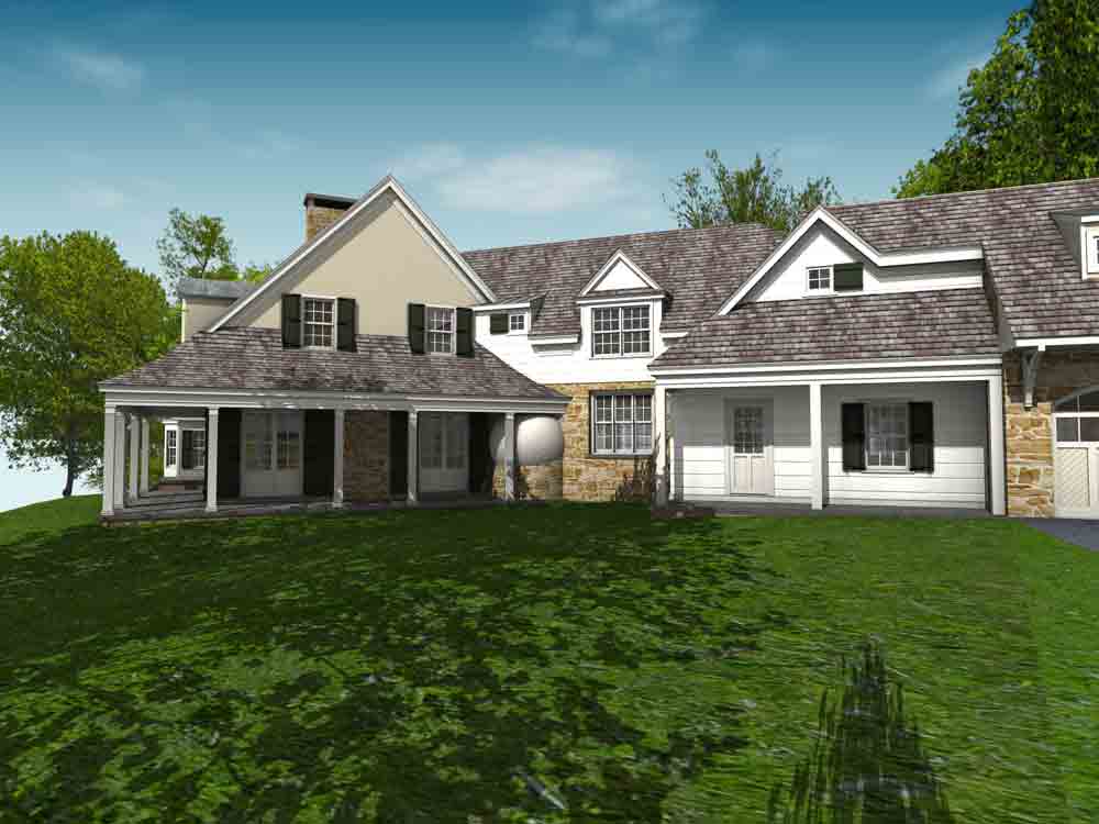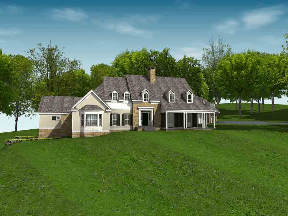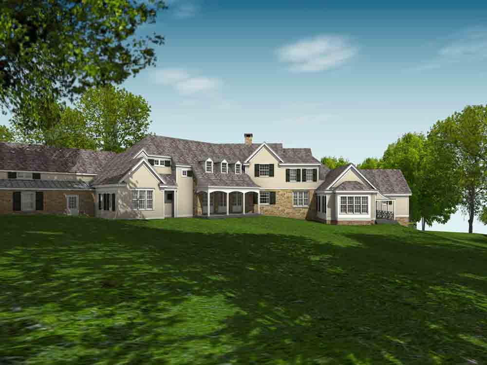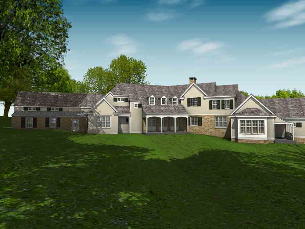 This design for a farmhouse has 5 bedrooms, 5 full baths, 3 half baths, office, sitting room, homework/playroom, family room, three covered porches, 3 car garage, lower level min-garage for sports vehicles, two fireplaces, and room to expand for guest suite above garage.