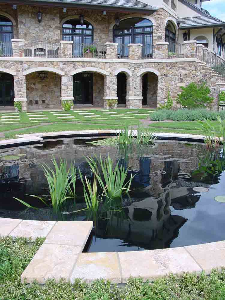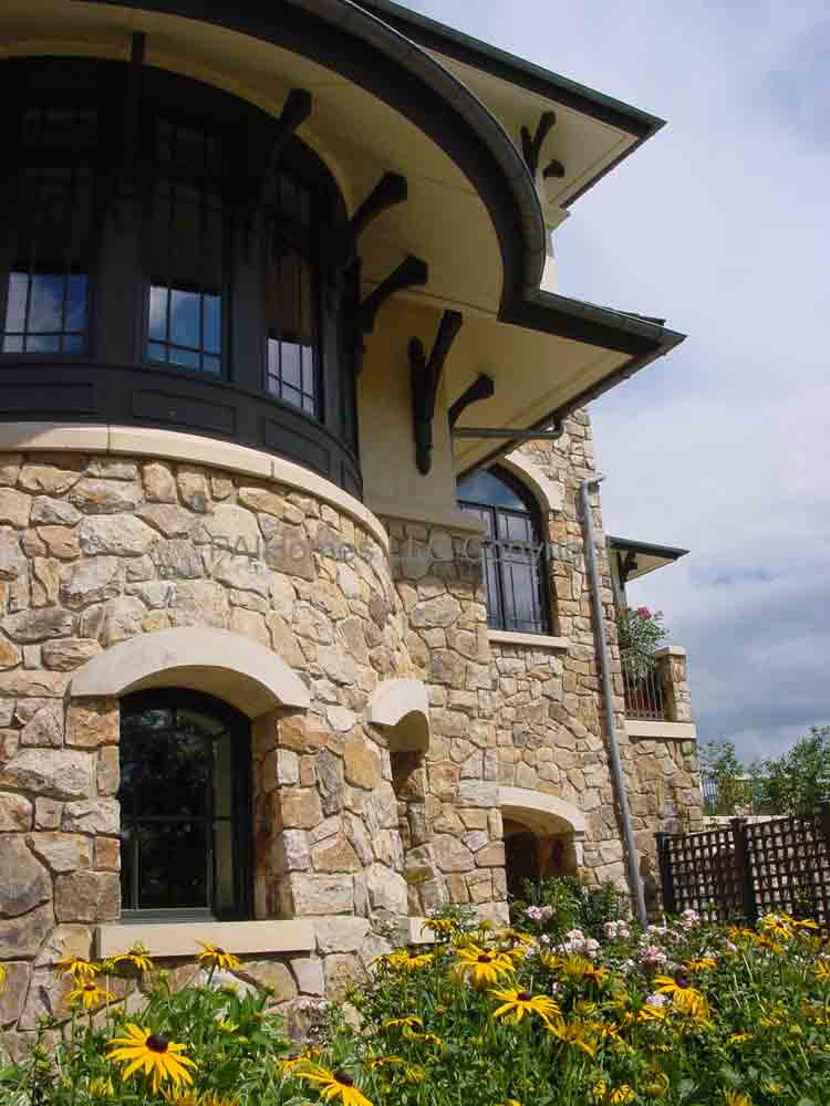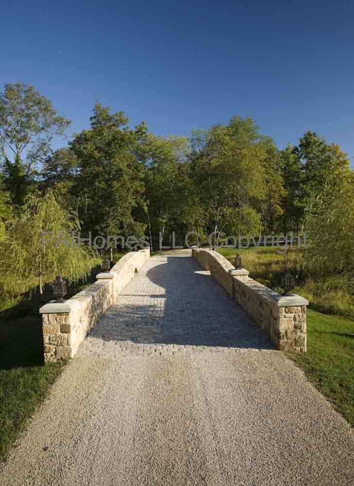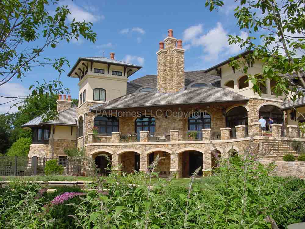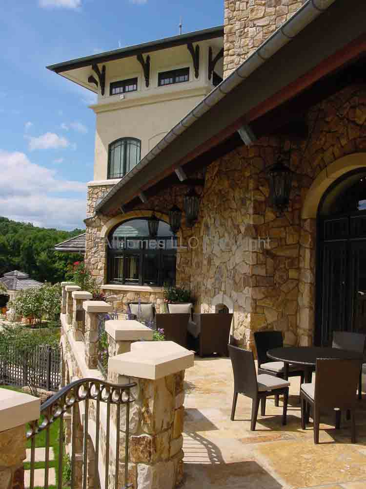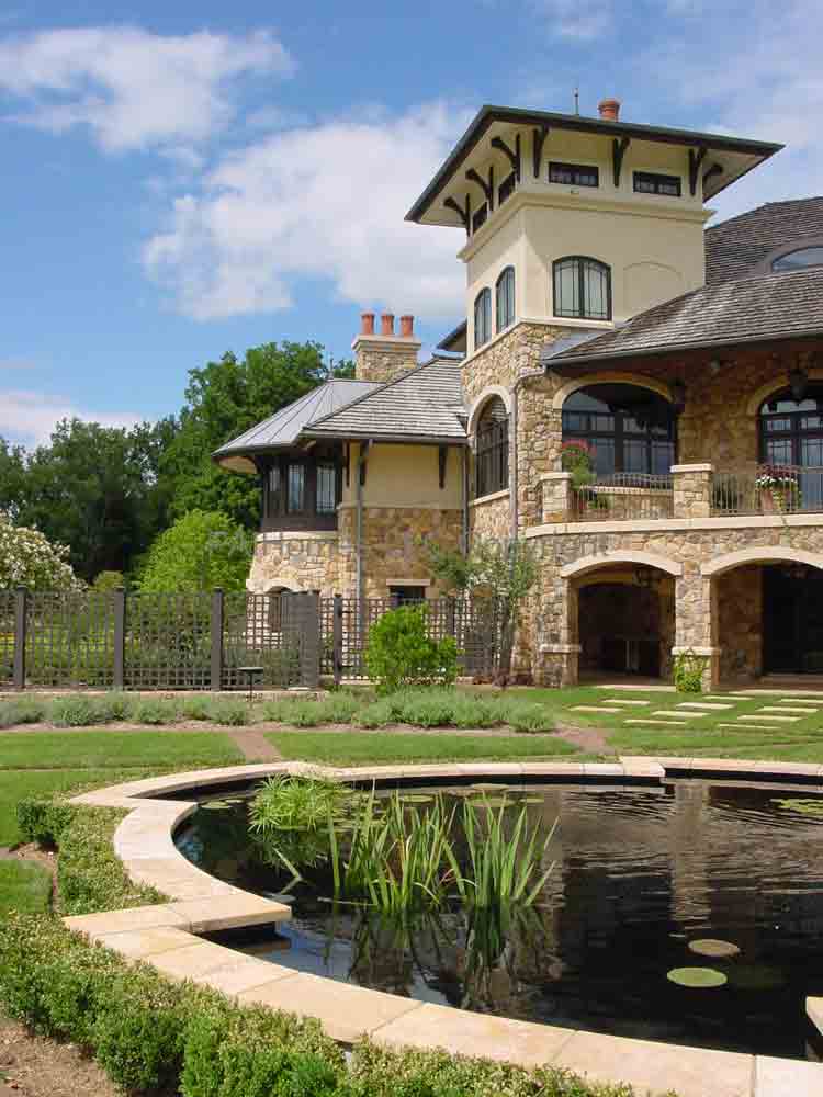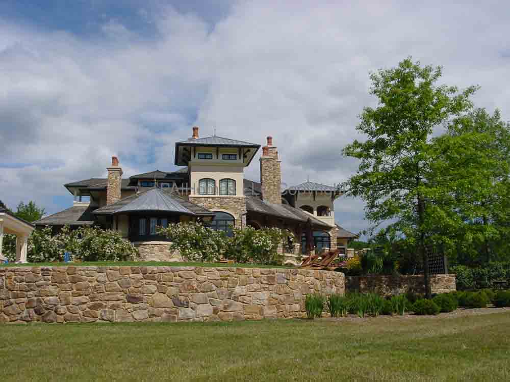 The home was designed to feel like a modern Tuscan villa. The home was positioned at the highest point of a 30 acre hilltop. The site provided the inspiration and the organization of the final design. Each room was designed to look at a vista and focal point that complements the rooms purpose. The kitchen looks out onto a pond, the library looks at a manicured hilltop, and the master bedroom has a view of the gardens and stream at the bottom of the hill.