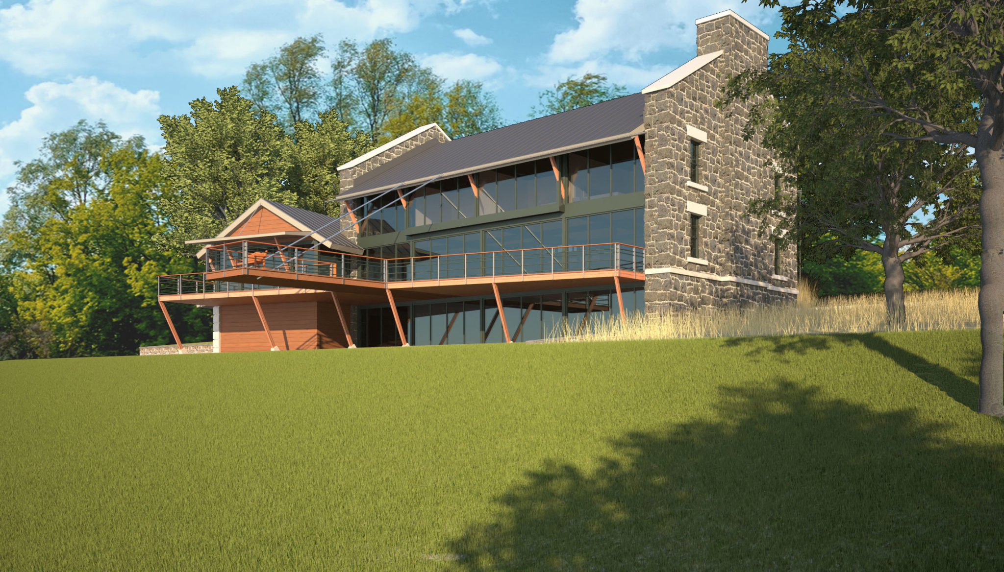 The home design scales from 3,000 SF to 12,000 SF to meet your lifestyle and budget. The primary materials are steel, concrete, glass and field stone. The combination of these materials help to evoke the emotions of the past. The open plan provides the convenience of the present.